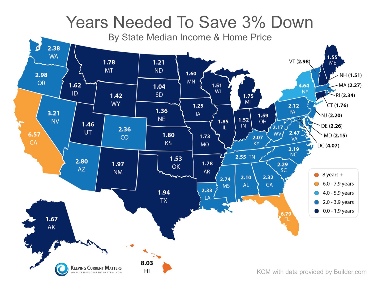 What if you were able to take advantage of one of the Freddie Mac or Fannie Mae 3% down programs? Suddenly saving for a down payment no longer takes 5 or 10 years, but becomes attainable in under two years in many states as shown in the map below.