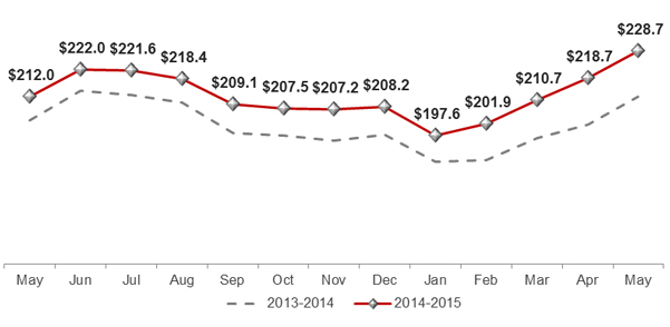 HOME PRICES In May, the median home price reached $228,700 according to NAR. This was an increase of 4.6% from April and was up 7.9% from May 2014.